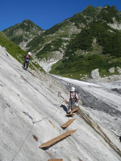 残雪少なく雪渓歩きが危険なため、岩盤スラブをトラバースする区間もあります!