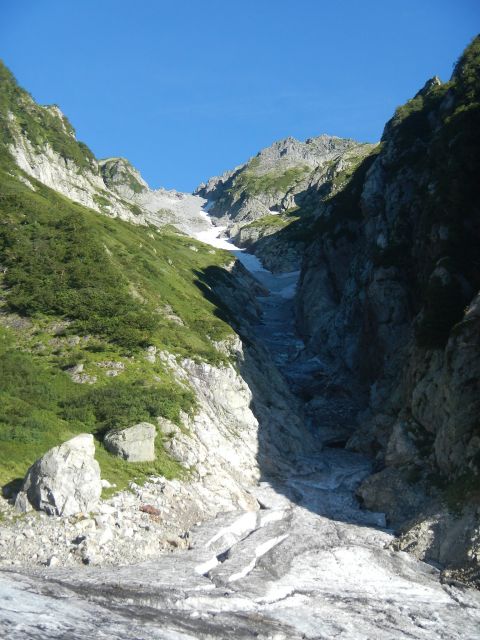 剱沢大雪渓も雪が少なくて大いに荒れており、数多くのクレバスやシュルンドがありましたが、夏道が整備されていました。ただし、一部区間(2か所)は雪渓横断が必要でした。帰路の私はアイゼン装着をさぼったため、20mほど滑落するアクシンデントもありました。反省しています!
