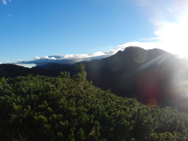 20日朝は快晴(6時前)の中をスタート。高く見えているピークが塩見岳です。この晴れ方はきっと雨になると話しながら歩きました。
