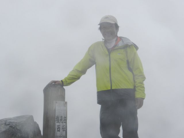 7時に本谷山(2657.9m)頂上、私ら夫婦、息子夫婦の4人パーティ。8時30分塩見小屋くらいから小雨。