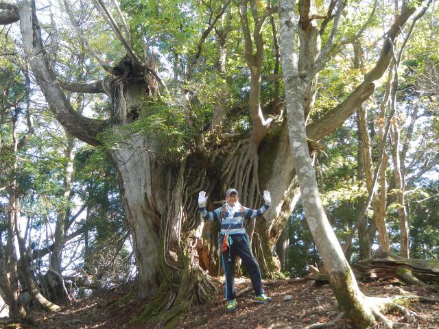 遡行も終わり、稜線にあがると存在感の大きい芦生杉が出迎えてくれました。ここP911で大休止し、ここから稜線・尾根伝いに下っていきます。途中、いくつも巨大な芦生杉に圧倒されながら進みます。