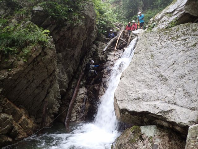 遡行終了間際の斜滝もザイルを張り、タイブロックでシャワークライミング。みなさん水の中を歩くのも慣れてきて、上手に水際を登っていきました。
