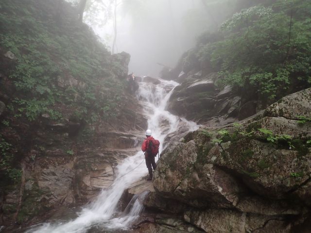 講習生はほとんどが沢登りが初めてで、水の中でも滑らない、というのを確かめながら慎重に進んでいきました。魚止めの滝はザイルで確保しながら登りました。取り付きまでのへつりで水の勢いに悪戦苦闘しながら岩登り講習の経験を活かしながらみなさん無事登りきりました。