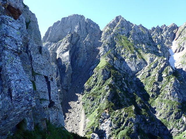 その後のルートファインディングに手こずりました。二度ほど間違えて引き返したり、登ったところからズルズル下ったりしながら、なんとか小窓ノ王の下に到着。目の前にこの世のものとは思えない眺め、池ノ谷ガリー。