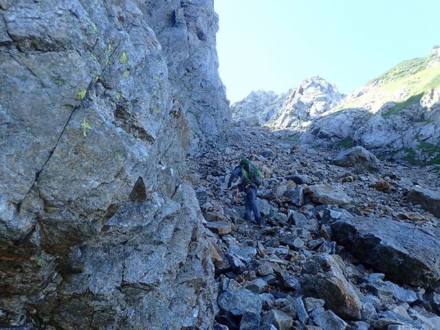 登っていく人がポツポツ見えます。「ラクー」石の落ちる音が何度も聞こえます。「ラクー」こちらも発射台というところを激下り。足場は不安定です。「ラク〜」池ノ谷ガリーを下ってくる人も石を落としています。無事に三ノ窓に到着。さあここから池ノ谷ガリー。幸いなことに前の人からは離れていたので上からの落石の心配はほとんどなし。降りてくる人もちょっとだけ。後ろに付いてきている人がいたので石を落とさないように。