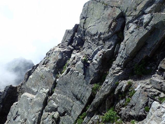 剱岳頂上も見えます。やったぜ~。しかしまだまだ気を抜けません。最後(?)の核心、岩壁のトラバースです。