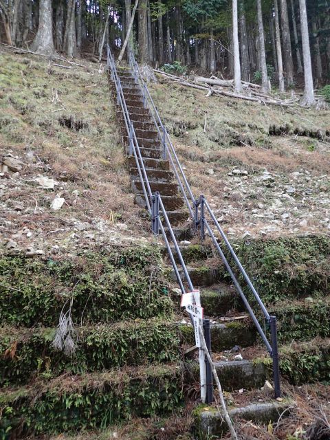 大和上市駅から乗った奈良ゆうゆうバスは満席で立つ人もいましたが、前鬼口でほとんどの人が降り、浦向から山に向かうのは我々のみ、山深い、秘境に来たという感じのところからスタートです。明瞭な道で「新宮山彦ぐるーぷ」さんの道標もあり助かりました。ただ途中で林道を横断し階段を登ったあとで、直答してしまい変な林道に出てちょっと迷いました。
