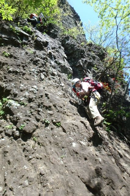 なんやかんやで進み、ハイライトの「鷹戻し」までやってきました。ややオーバーハングした岩を鎖で登ります。今までのような親切な手がかり・足がかりは少なく鎖の力にかなり頼ってしまいます。ここで初めて自己ビレイを取り休憩しつつゆっくりと登っていきました。「手を離したらお陀仏や~」と思うとほんまに手に汗握りました・・・こわかった( ゚Д゚)
