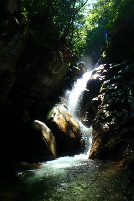 その後も光輝くゴルジュや滝、美しい緑、エメラルドグリーンの釜に歓声をあげながら遡行しました。