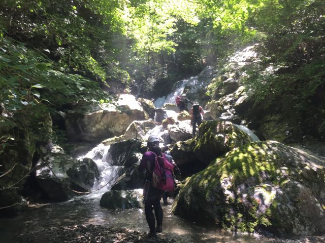 沢に入っても水の多さと、水圧で足が持っていかれてしまい、何度もズルッ(゚o゚;;っと滑ってしまいヒヤヒヤしていました。スマイルさんYさんが必要に応じて、お助け紐を出してくださったのでとても心強かったです⤴︎