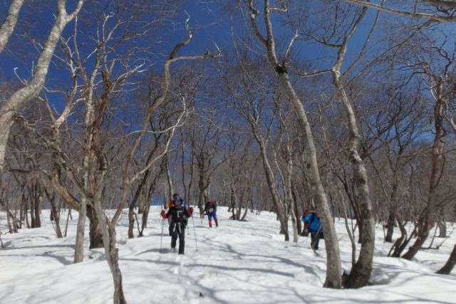 途中で男性陣はワカンを履き先導。ワカンでも雪を踏み抜き苦戦しつつ登る。