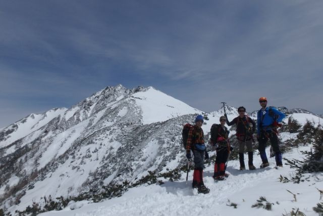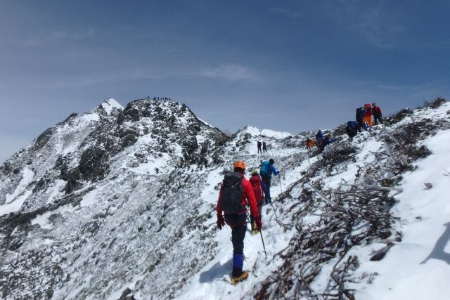 独標に近くなるにつれ、岩場が多くなる。アイゼンワークに気を付けながら登っていく。独標の上には沢山の人がいるのが見える。