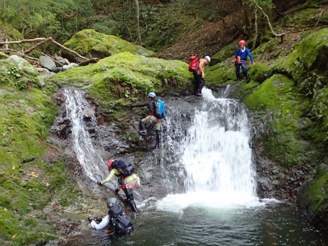 ロープワークに手間取り、遊びすぎて時間がかかったので大滝はやめて植林小屋までにしました。小屋手前の斜滝10mをみんなノーロープで登りきり大満足。非常に達成感のある楽しい沢でした。