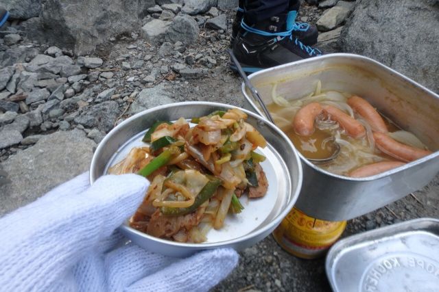 スマイル班のウインナースープ。玉葱たっぷりで美味しい。お裾分けしていただいた回鍋肉。この為にハムくんさんはフライパンを持参😅
