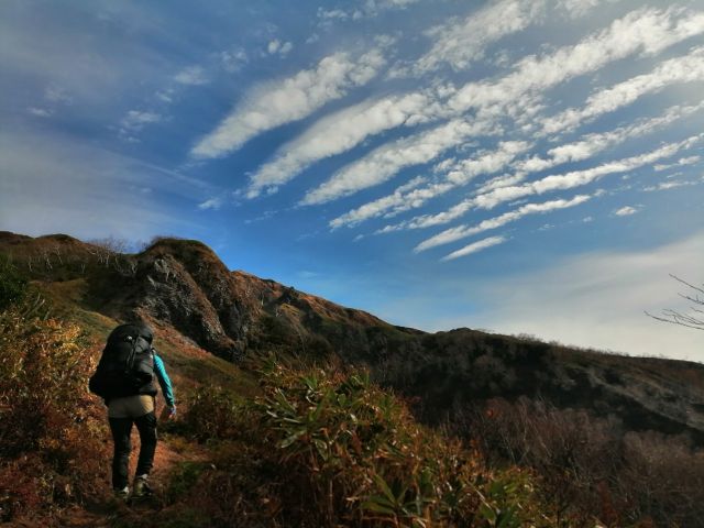 始めは樹林帯。最初は青々としていた木々も標高を上げるに従って徐々に色付き、六本檜に辿り着くと眼下には一面の紅葉!日が陰り気味で写真はイマイチですが、紅葉タイミングはバッチリです!「皆に見せたかった!」というスマイルリーダーの想いも重ねた絶景に、皆でホッと一息。