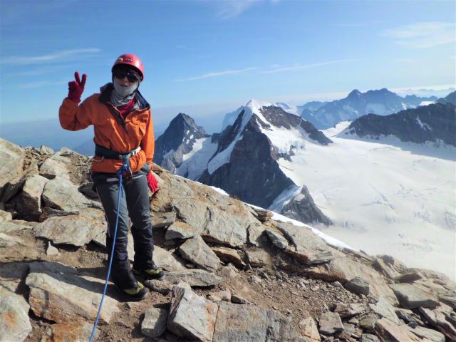 8/27 2:30に起きて、朝食後直ぐに用意をして3:30に出発しましたが、既に5~6パーティーは先行して遅めの出発でした。カッパを着て歩くと汗ばむくらいの暖かい日でした。空一面の星空を眺めながらヨッホ駅で荷物を整えアイゼンを付け、ザイルを二人コンテでガイドと結び雪の斜面を速足で下りました。トラバース気味に取り付きに着くと、急峻な斜面をトラバースして雨量計まで上がる所で、足元が斜面全体凍り付いていて大渋滞でした。不安定な足元に足を置いて渋滞を待ちながら、少しずつ進みました。雨量計の所に上がると空が明け始め、アイゼンを取り、ここからは2―3級の岩をかなりの距離で登り、途中K氏が先行するのを待って登る急な場所もありました。この辺りは見渡す限りの岩稜帯で、ユングフラウ(若いお嬢さん)の名前らしくない荒々しい場所が続き、さらに左に回り込んで、さらにかなり長く岩を登りました。やっと雪面に出てアイゼンを付け少し休憩し飲み物を飲み、ここからは雪になったり岩になったりですがしっかりトレースのある雪面を登りながらぐるっと左にまいて広くなった所で、ここからは1:1で行くとのことで、主人が待ち、私とK氏でザイルを結びなおして行きました。ここからは一部屋くらいはありそうな黒く大きなシュルンドがねじれながらとぐろを巻いたように雪面に入り込んでいて、底を覗くと深く何処まであるのか、ものによってはゴーッと音のする場合もあり、その間を縫うようにうまくトレースが付いていました。ここをぬけてロートタールザッテル(コル)に上がり込み、メンヒほどではないが細い雪稜をしばらく進み、急な凍てついた雪の斜面をトレースに従いしばらく登り、岩をコンテで素早くかなりの距離で登り、岩から行ったり雪面を行ったりして、そのうち山頂に続く岩雪交じりの岩場に出て岩を登り9:30山頂4158mに着きました。天気も良く、周囲の様々な山の説明を聞きました。遠くマッターホルンやモンブランも雲に浮かぶように見えました。一面のスイスの山並みに感動し、登頂のお礼を言い、写真を撮って下山しました。