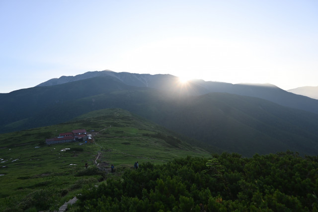 最終日快晴満天の星の中クリンさんは2時に出発、私は日の出前につっかけを履いて小屋横の太郎山に。
