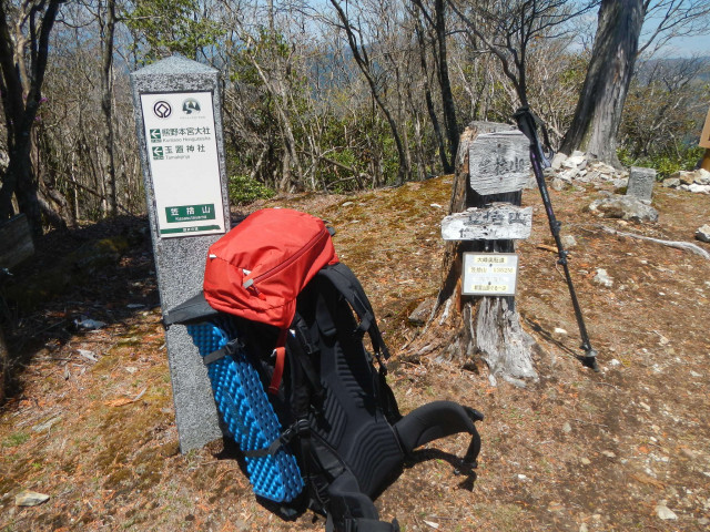 笠捨山頂上 その昔西行法師がこの山頂からの美しい眺望に感嘆して笠を投げ捨てたのが山名の由来であると現地案内板にありました玉置神社に向かう舗装道(林道)に合流したとき既に16時をまわっていました。非常に残念で悩みましたが、こんな状態で明日熊野までの長い下りを歩くのは無理だと判断し、今日は玉置山展望台か玉置神社駐車場でテント泊し、明朝タクシーを呼んで下山することに心で決めました。そうしてゆっくりと舗装道を歩いていると、展望の良い駐車スペースに1台の車を停めて男性3人の方が談笑されてます。辛そうに歩いている私を見て声をかけて下さいました。事情を話すと、最寄りの処まで送ってくださるとの大変暖かいお言葉。迷わずお言葉に甘えることにしました。3人の方は桜井から玉置神社に参拝した帰りとのことなので、帰路途中の近鉄の大和上市駅まで送っていただきました。本当に玉置神社、神様、仏様のお導きだとしか思えません。大和上市駅に着くとまた運よく阿部野橋行の急行が到着したとところで、この日21時半に帰宅することができました。