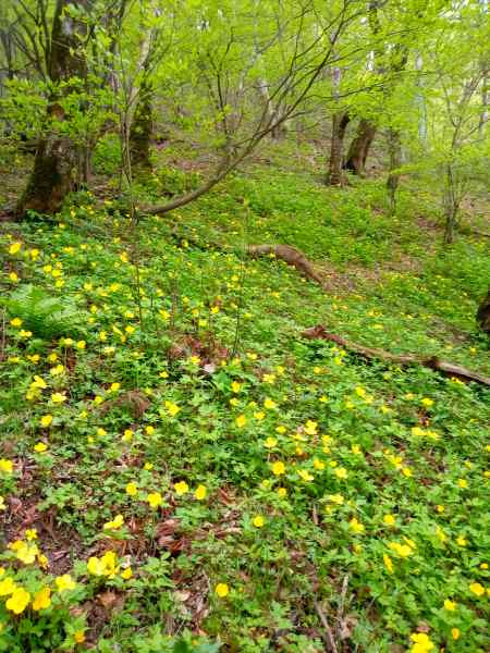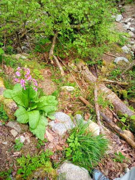 金剛山カトラ谷に花山行に行きました。行く前からメールで、二輪草は少し遅いかとか、ヤマブキソウが見ごろだと綺麗だとか聞いて、目的の花は咲いているかなと思いながら歩きました。歩き始めて直ぐにクリンソウが2-3本、林道脇に咲いていました。濃いピンク色で、サクラソウに似た花ですが、花全体も大きく綺麗です。カトラ谷に入ってからは、ロープの張られた場所も通過しながらカトラ谷を詰め、白いヤマシャクヤクが一面に咲く、美しい場所へ。花も大きく素敵でした。白いじゅうたんの様な可憐な二輪草、沢沿いに多いクリンソウもまだ見頃、ヤマシャクヤクの少し上には黄色いヤマブキソウが山肌一面に咲く場所があり、大変綺麗で、写真撮影を楽しみながら山頂に向かいました。山頂では咲き残った八重桜を鑑賞し、各自昼食、美味しいリンゴのタルトタタンもごちそうになりました。参拝も済ませ、山頂から植物園を回り、薄ピンクのシラネアオイ、ピンクのシャクナゲなどを鑑賞し、旧ロープーウェー駅跡をへて、山頂広場でキツネさんがコーヒーを入れてくれました。コーヒーやお菓子で休憩、モミジ尾谷から、あの花咲いているかな、と言って下りました。タツナミソウかイナモリソウか、薄紫の花がひとつ咲いていましたが、私はカタカナ名前が覚えられませんでした。すみません。滝を見たりしながら元の駐車場へ下山しました。