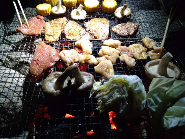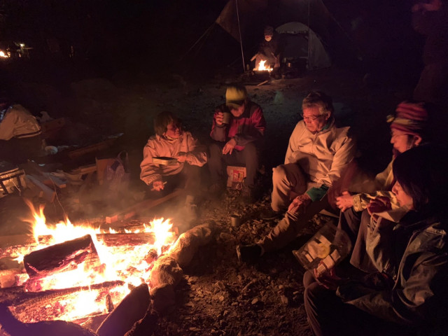 いつものように、焚火を囲んで最上等の焼肉やキツネさん自慢の粕汁をいただきながら、山談義等で盛り上がりました。また、大量のお酒も消費されていました。私もよく覚えていませんが・・・。