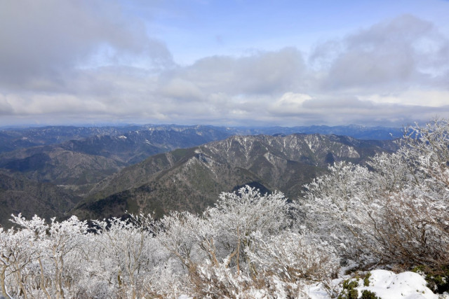 御殿山からは早くも霧氷が溶けてしまった樹林帯を歩き、最後は霜が溶けてドロドロになったぬかるみ道を歩いてお昼に下山。くつき温泉てんくうで汗を流して帰阪しました。