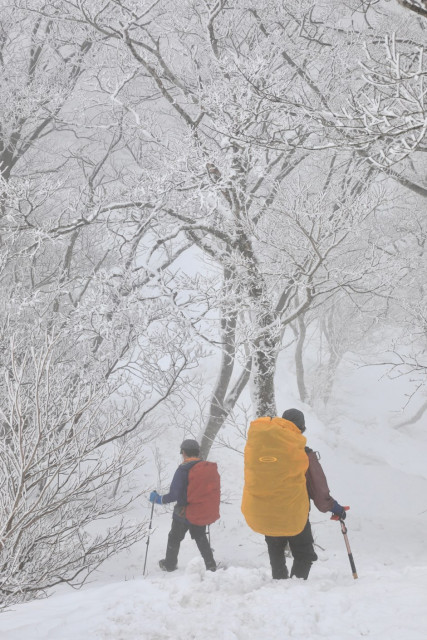 2日目は明け方に外を見ましたがやはり曇り空。明るくなってから外に出て東の空を眺めると雲の隙間からぼやけた朝日を眺めることができました。のんびり朝食を食べてから荷物をまとめて9時に出発。天気は時折日が差すまでになり、霧氷が輝いてその美しさになかなか先へ進めません。