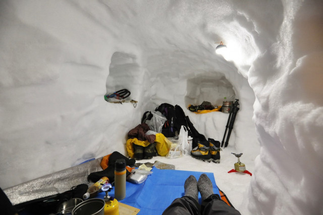 それからは私が奥へと掘り進み、キツネさんが掘り出した雪を掻き出すという連携プレイで穴をどんどん広げていき、雪洞が完成。壁や天井もきれいに仕上げ、テントよりも快適な空間が出来上がりました。雪質は崩れるほど柔らかくはなく、スコップが刺さらないほど硬くはなく、絶妙な硬さでコンディションは抜群。子供の頃砂場でトンネルを掘ったような感覚でめちゃくちゃ楽しかったです。