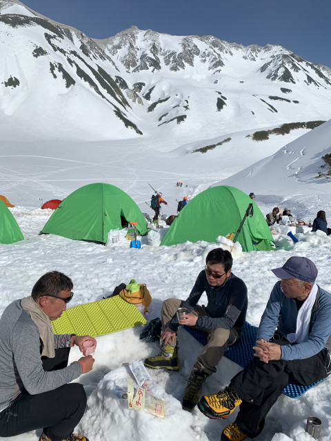 すでに他のパーティでテン場はいっぱいでしたが、2張り分のスペースを見つけ、テント設営。それにしても、色とりどりのテントが並び、スキー板を置いて、テント脇でビール乾杯してたり、のんびり寛いでいる人を見ていると、どこかのスキー場か、まるで真夏のビーチのような賑わいでした。今日の行程は終わりなので、辺りを散策し、雷鳥沢ヒュッテで、缶ビールを購入。(なんと生ビールも売ってます!)テン場に帰って、マングース会長が作ってくれた、雪のテーブルと椅子で、としきさん達と、早速宴会開始。なんとも贅沢な時間でした。