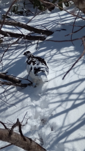 5/3 5時頃よりリエさん、その後マングースさんが切符売場に並んでくれるが、すでに60人程の行列。(今回、アルペンルートの切符を、マングースさんが、WEBで発売と同時に買おうとして、瞬時に売り切れる) 5:50頃より切符発売開始。6:40始発でしたが、8:50のケーブルが取れました。観光気分でケーブル乗車 春山テント泊装備の入った、重量のある重たいザックを、スタッフの方が手際良く、ケーブルに連結した台車に載せて行くが、腰大丈夫かいな?と要らぬ心配‥‥。高原バスでは、観光アナウンスが流れ、ゆっくり見所を走ってくれるが、昨夜寝不足で、バスの車中、ほとんど寝てました!室堂着いてから、誘惑に負けて、高原そばで小腹を満たし、いよいよ出発。たくさんの観光客で賑わう中、今日は、雷鳥沢に下るだけ〜、と気軽な気分で歩き始めるが、すぐにザックの重さが背中にこたえます。途中のハイマツ帯で、雷鳥発見!ちょうど冬毛と夏毛の入れ替わり時期で、まさに「雷鳥の里」!雪山をバックに撮りたいな〜と粘るが、雷鳥はハイマツ帯の中をウロウロするだけで、中々出てきてくれません。それでもなんとか写真を撮り、雷鳥のお陰で、元気をもらい、雷鳥沢に到着しました。
