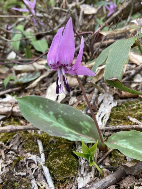 標高差は600m程度、2時間ほどで、山頂到着。途中、残雪もありましたが、アイゼンは必要ありません。山頂付近は、カタクリの花が満開でした。