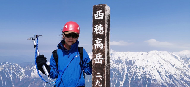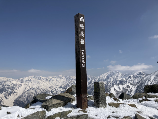 稜線はほぼ雪が溶けてなかったところ、GW前半の積雪でまた雪がしっかり付いていました。山頂直下の登りはピッケルを使って這い上がりました。まだチャンピオンピークかと思って登っていたので、西穂高岳の標識を見た時は拍子抜けしました(笑)