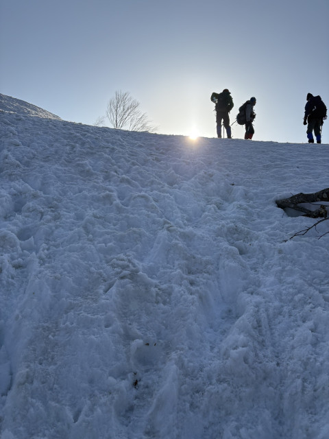 下山は気温が上がり、雪も緩くなり、ペースが