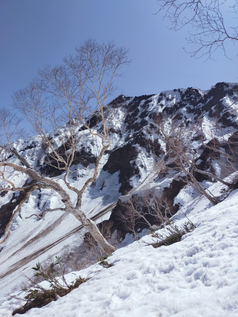 取り付き暫くすると急斜面に谷が深いトラバースに差し掛かる、スマイルさんは朝は雪が締まって安全と言われたが、高度感に緊張する。何とか通過出来たが、下りは使いたく無いトラバースだった。