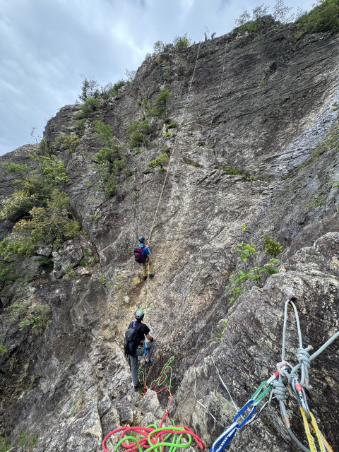 その後、懸垂下降の基礎をしっかり学び ※懸垂下降が一番事故が多いのでここはしっかり念入りに学びました。印象に残ったのは 沢の懸垂の場合 最初の人が石など落石しそうな岩はロープに当たって落ちることもあるから下に注意して落としてあげると言うのが なるほどと思いました。