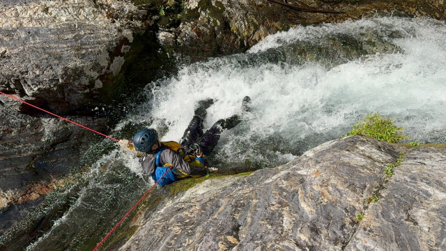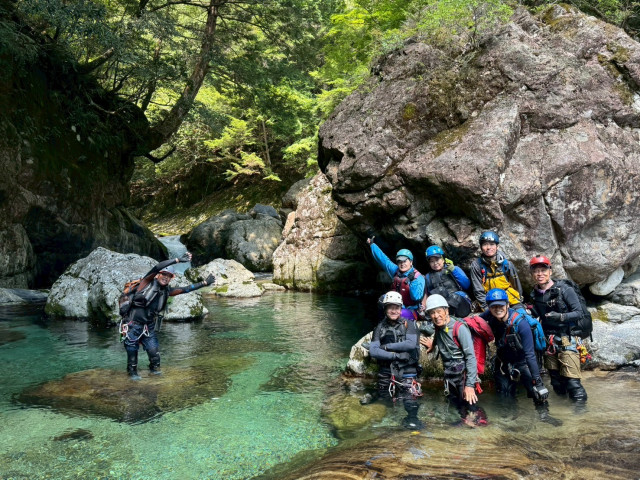 いざ入渓し、前半は川を下りながら、ダイブしたり、スライダーしたり、川の流れに乗ってプカプカと浮いて流されたり、巻いたりして、目的地である不動七重の滝の落ち口に到着
