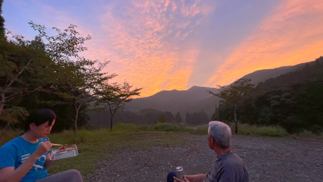 誰もいない広々とした場所で、ご飯を食べながらお酒も進み、ゆっくりと良い時間。
