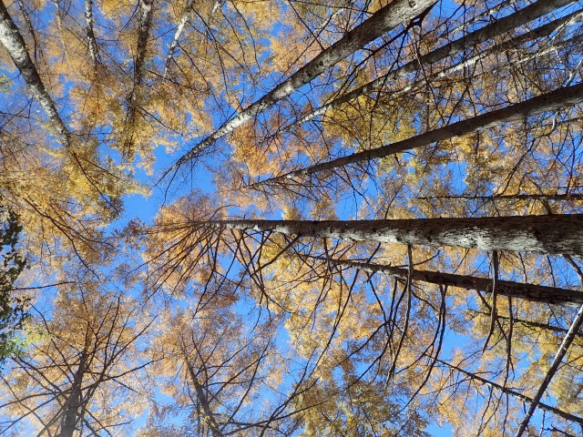 アイゼン(チェーンアイゼン)を装着し一歩一歩雪を踏みしめ慎重に下山スタート。樹林帯では風や雪も収まり始め、雪景色と紅葉を観ながらの下山。