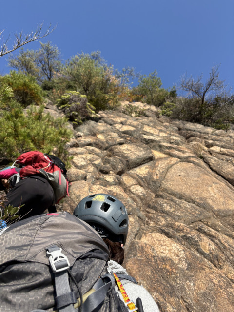 A懸で休憩中アイゼンとピッケルで壁っぽいところを登ってみましたが、まだまだアイゼンの前爪のみに体重を掛けるのが怖い。ピッケルは2点で安定させると教えていただきましたがこちらも怖いです。