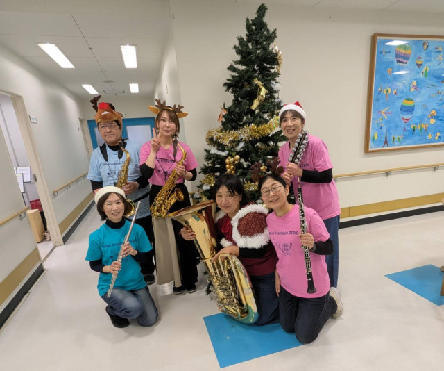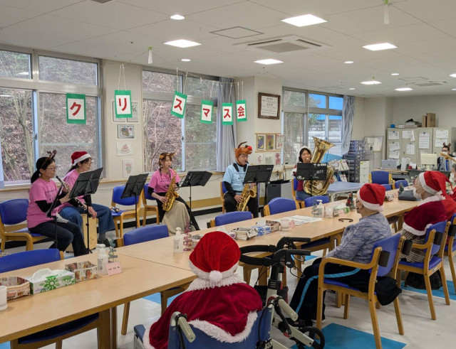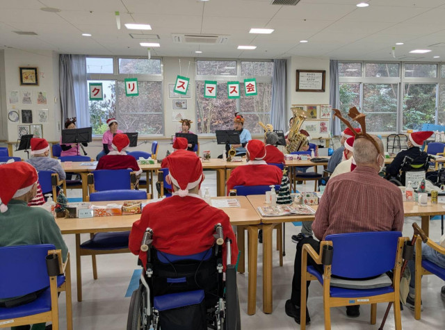 午前中はホームグラウンドであるふたば学舎に集合し、演奏曲の練習をしながらプログラムの最終調整を行いました。その後、午後からヴィラ光陽様を訪問。会場に到着すると、皆さまがクリスマスの衣装に身を包み、盛大に迎えてくださり、私たちの気持ちも一気に高揚しました。